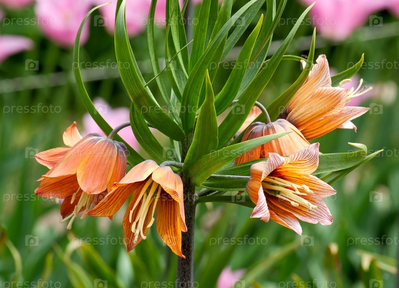 Фритиллярия императорская - оранжевые цветы крупным планом на фоне цветников