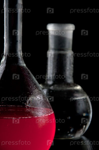 Лабораторные колбы с реактивами на черном фоне
