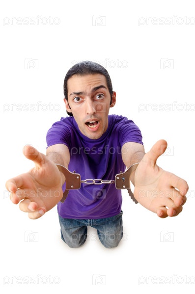 Молодой мужчина в наручниках на белом фоне