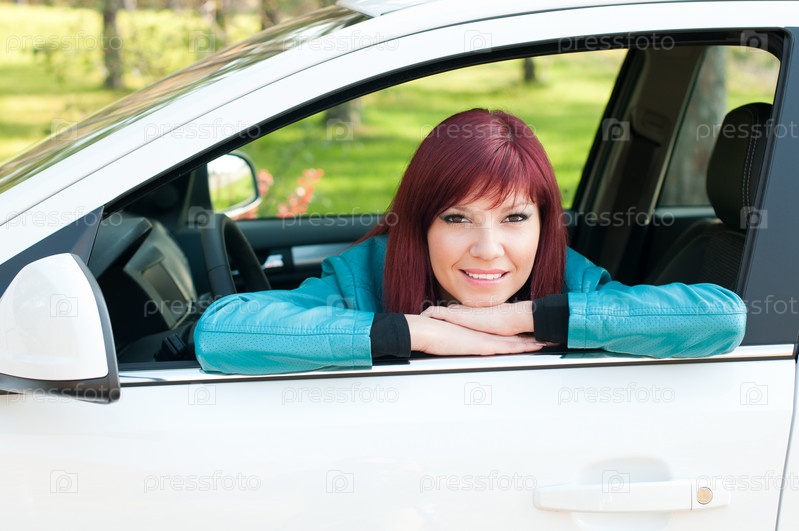 Молодая девушка сидит за рулем автомобиля, улыбается и смотрит в камеру