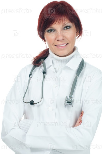 Портрет улыбающейся женщины-врача в медицинском халате со стетоскопом, белый фон