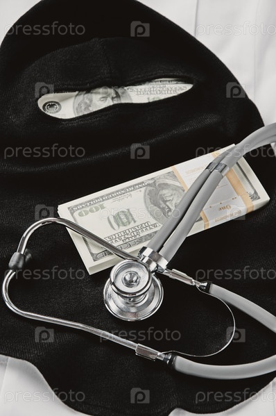 Черная маска, фонендоскоп и пачка долларов на медицинском халате