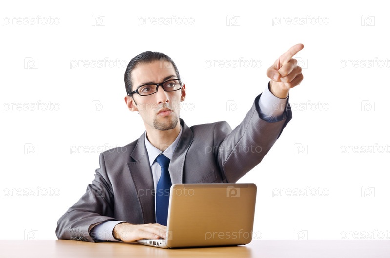 Молодой бизнесмен с ноутбуком, сидящий за столом