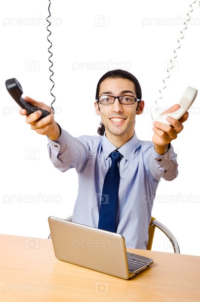 Молодой бизнесмен, сидящий за столом с телефонными трубками