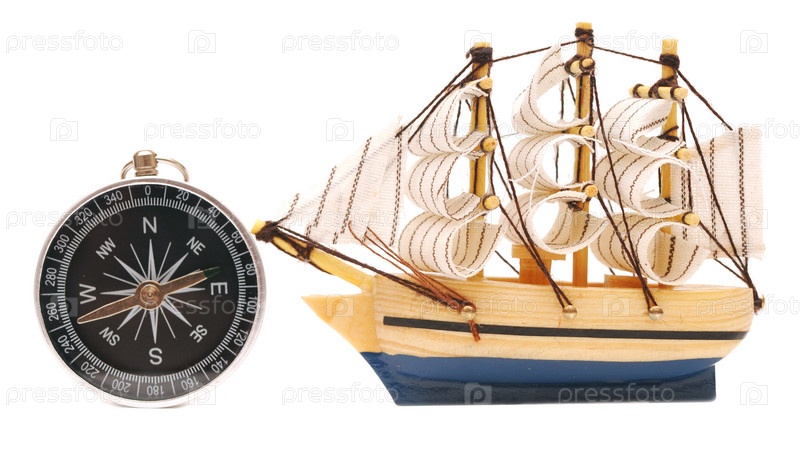 Компас и классическая модель корабля на белом фоне