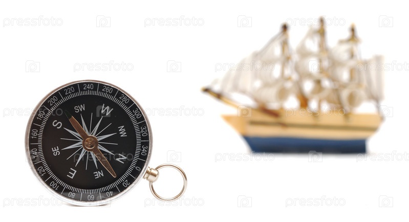 Компас и классическая модель корабля на белом фоне