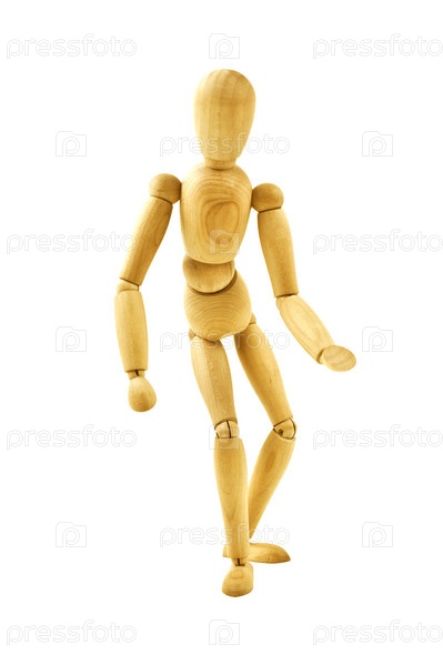 Бегущий деревянный манекен изолирован на белом фоне вблизи