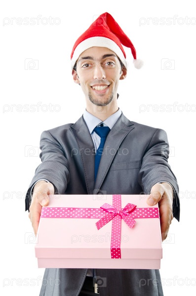 Молодой бизнесмен с рождественским подарком в руках