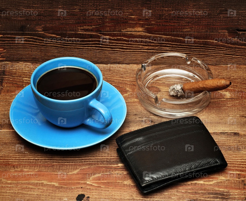 Кофе, сигара в пепельнице и кошелек