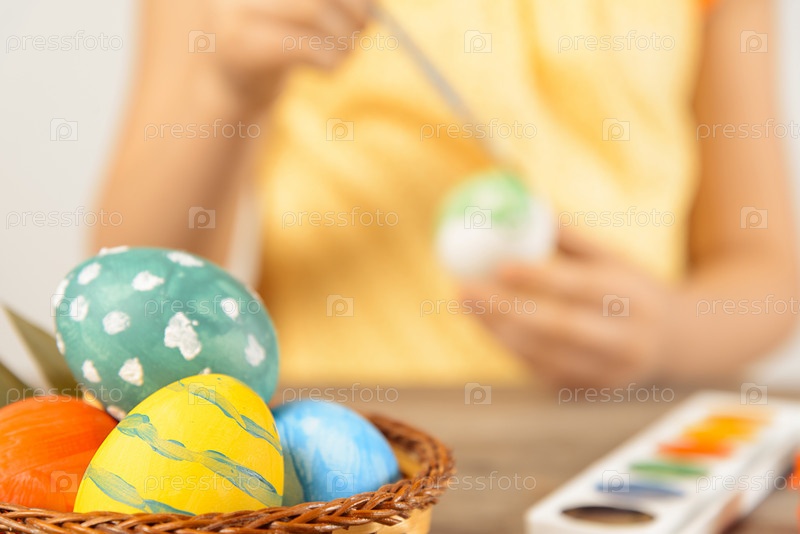 Ребенок рисует яйца на Пасху, фокус на яйца