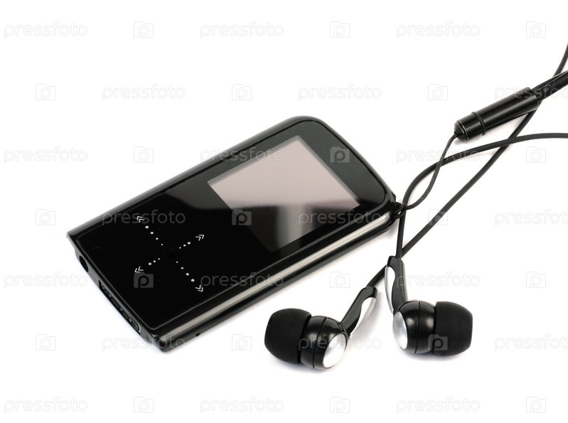 Черный музыкальный проигрыватель с наушниками на белом фоне