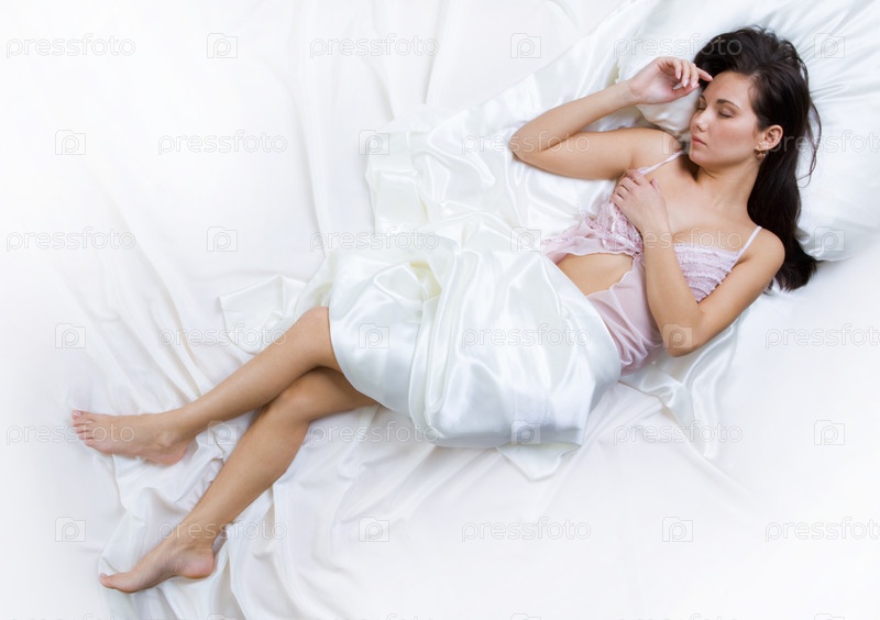 Сверху вид на красивую женщину в белье, которая мечтает о постели под шелковыми простынями