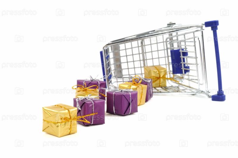 Опрокинутая тележка и подарочные коробки. Изолированные на белом фоне