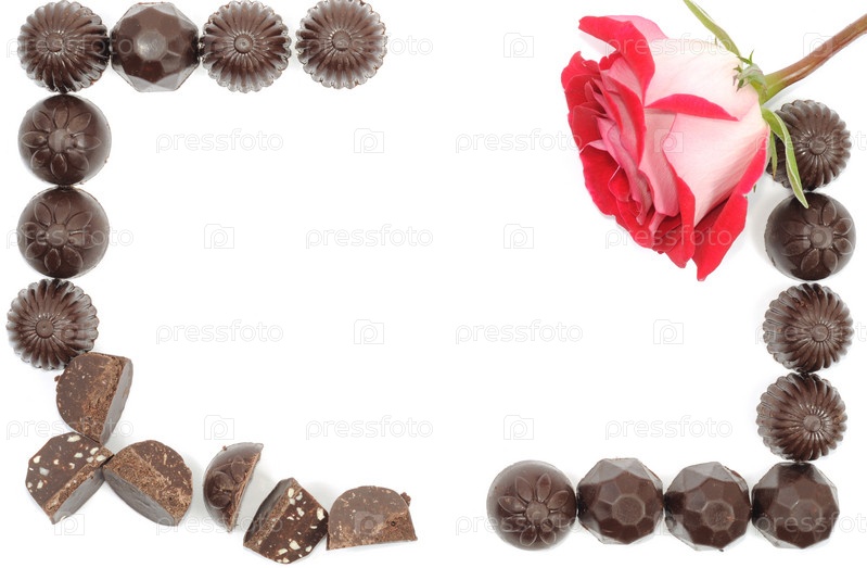 Красивая красная роза и рамка из шоколадных конфет. Изолированные на белом фоне