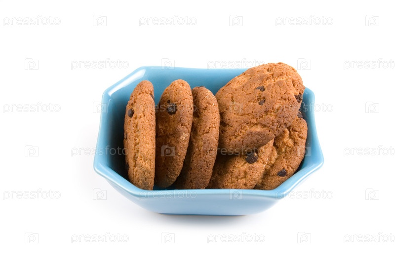 Овсяное печенье в синей тарелке на белом фоне