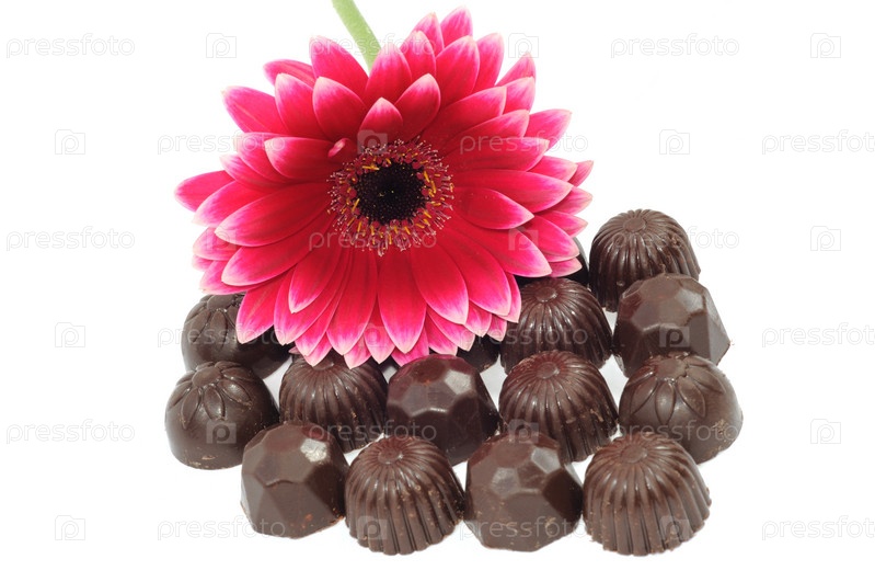 Красивый розовый цветок и шоколадные конфеты. Изолированные на белом фоне