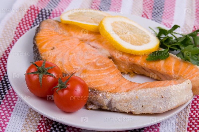 Стейк из лосося с овощами и лимоном