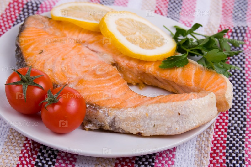 Стейк из лосося с овощами и лимоном
