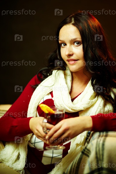 Улыбающаяся девушка в белом шарфе держит стакан чая