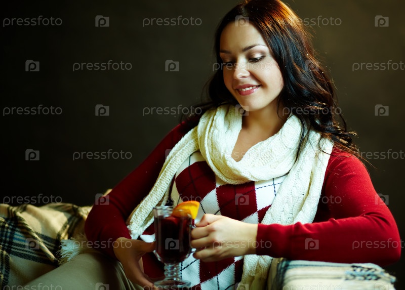 Улыбающаяся девушка в белом шарфе держит стакан чая
