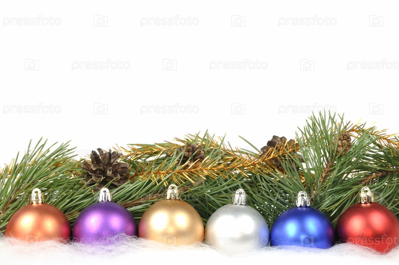Сосновые ветки с шишками и елочными украшениями на белом фоне