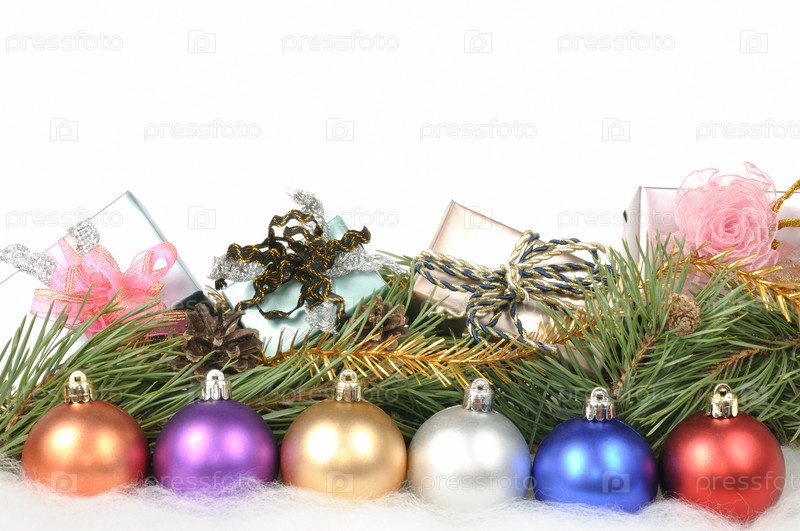Рождественские подарки и елочные украшения на белом фоне