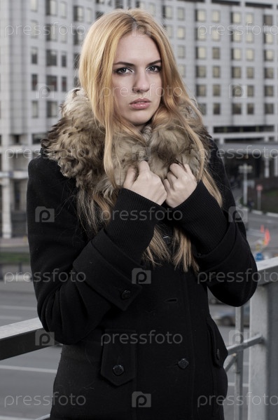 Молодая женщина в черном пальто на фоне города