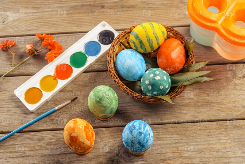 Деревянный стол с украшениями на Пасху
