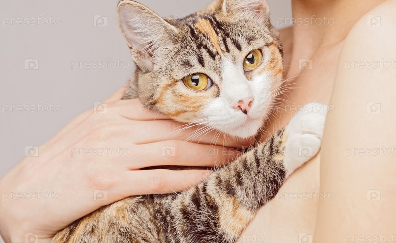 Женщина держит полосатый Кот