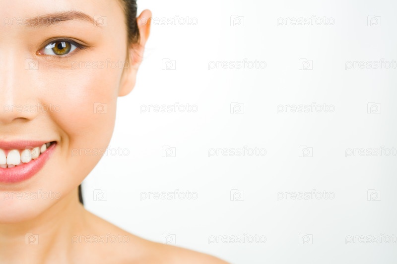 Ближайший снимок половины лица молодой свежей женщины, которая слегка отворачивается с улыбкой на белом фоне