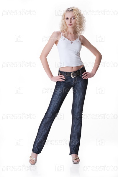 Молодая красивая блондинка в модной одежде на изолированном фоне