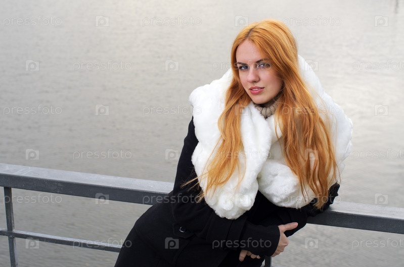 Красивая рыжеволосая женщина в черном пальто с белым меховым воротником стоит на мосту