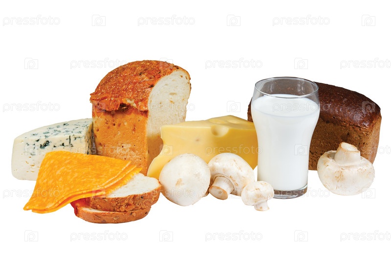 Хлеб, сыр, свежие шампиньоны и стакан с молоком