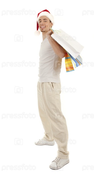 Молодой мужчина в шапке Санты с подарочными пакетами