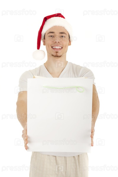 Молодой мужчина в шапке Санты протягивает подарочный пакет вперед