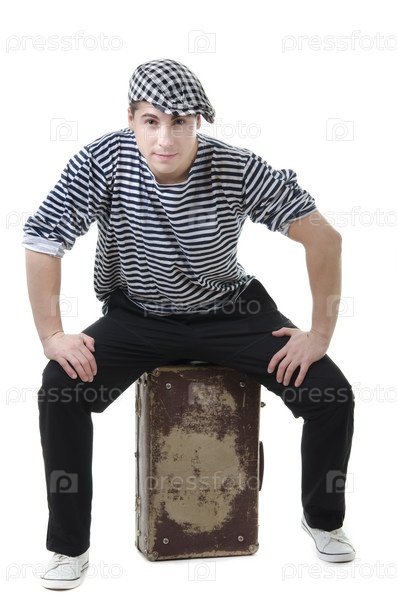 Молодой мужчина сидит на чемодане на белом фоне