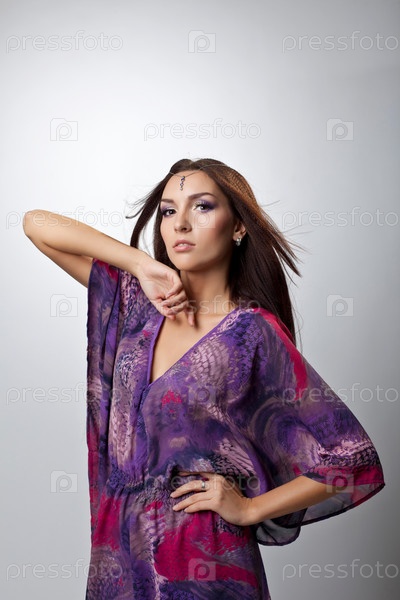Молодая женщина в индийском сари на сером фоне