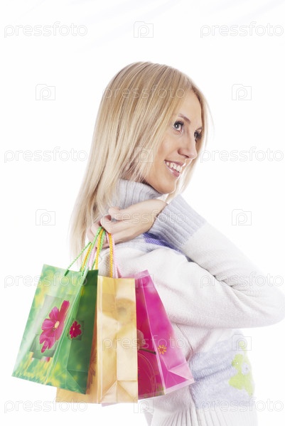 Улыбающаяся девушка с покупками за спиной