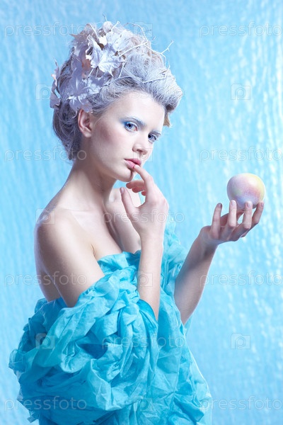 Ледяная фея с замороженным яблоком на голубом фоне