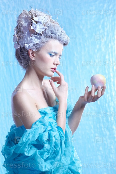 Ледяная фея с замороженным яблоком на голубом фоне