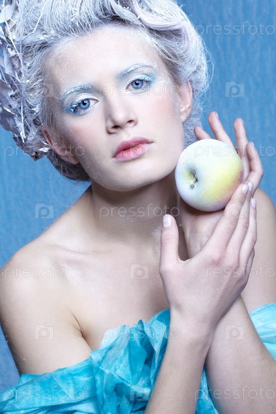 Ледяная фея с замороженным яблоком на голубом фоне