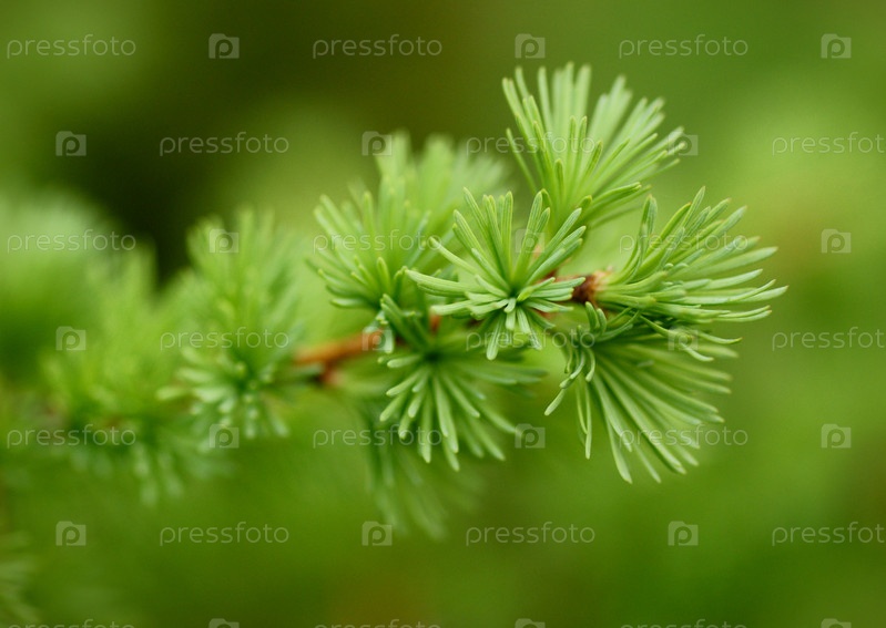 Ветка лиственницы крупным планом на зеленом размытом фоне