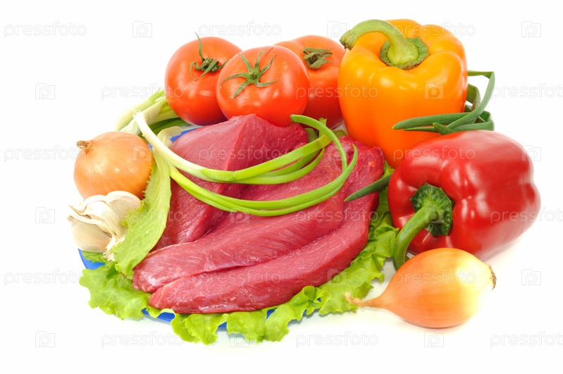 Куски сырой говядины со свежими овощами на белом фоне