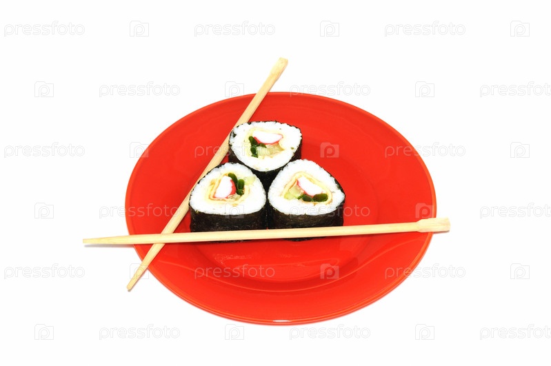 Традиционные японские суши на красной тарелке на белом фоне