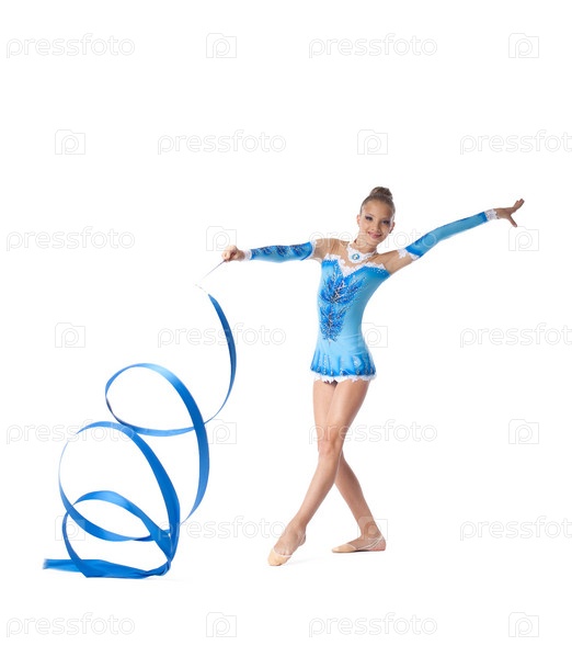 Профессиональная гимнастка делает упражнение с лентой на белом фоне
