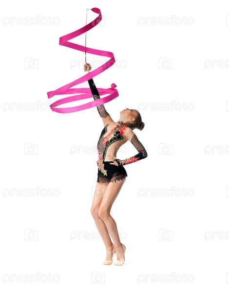 Профессиональная гимнастка делает упражнение с лентой на белом фоне