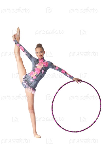 Профессиональная гимнастка делает упражнение с обручем на белом фоне