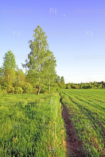 Поле. Ростки пшеницы и березы на заднем плане
