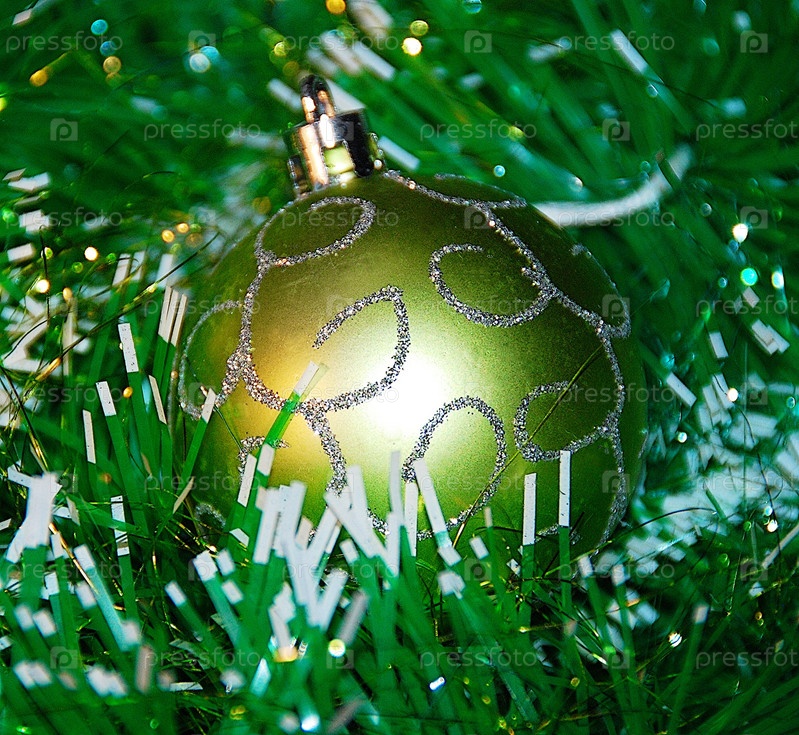 Зеленый елочный шар лежит в новогодней мишуре крупным планом
