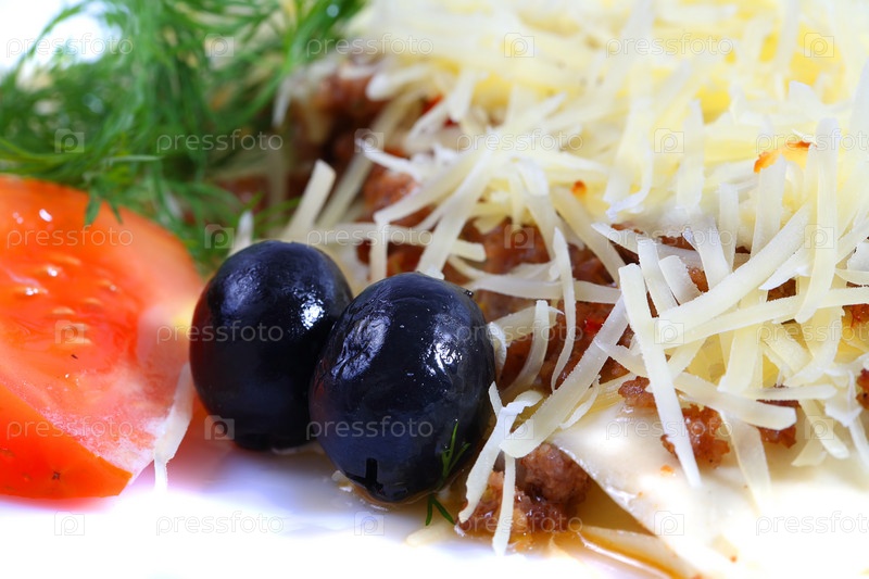 Жареное мясо с тертым сыром, две маслины, помидор и укроп